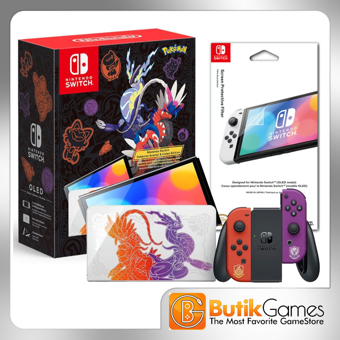 Nintendo Switch – OLED Model: Pokémon Scarlet & Violet Edition hadir dengan desain spesial yang menampilkan ilustrasi Pokémon Legendaris dari game Pokémon Scarlet dan Pokémon Violet, yaitu Koraidon dan Miraidon, serta Pokémon partner Sprigatito, Fuecoco, dan Quaxly.